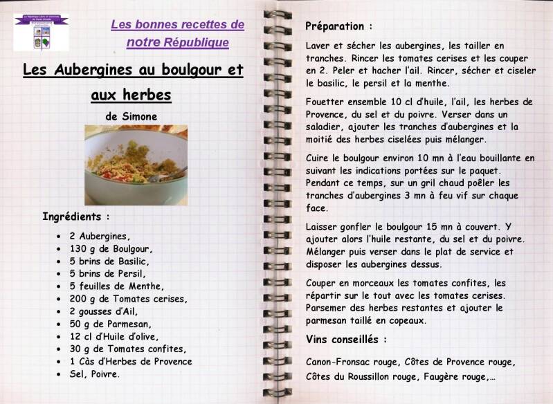 Nous vous proposons une recette qui nous est partagée par Simone, notre ambassadrice culinaire en Bourgogne : "Les aubergines au boulgour et aux herbes".