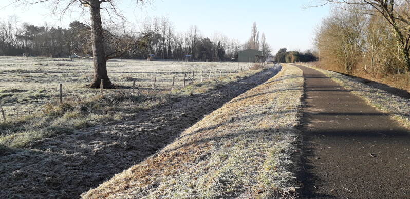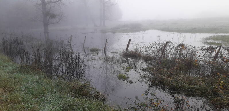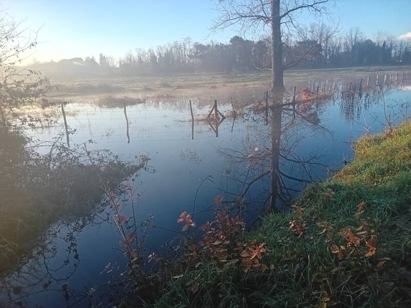 Samedi 16 décembre 2023, Une marche sur la piste cyclable entre Le Pontet et Etauliers avec le brouillard et des paysages inondés.