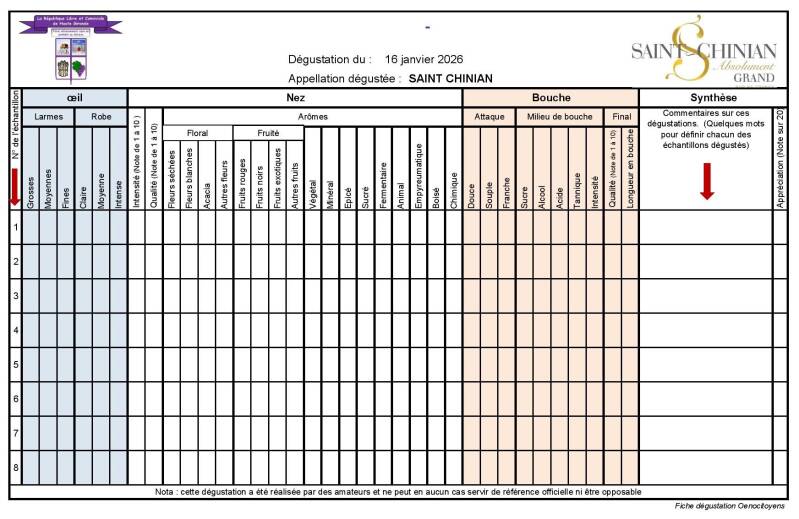Le Ministère de l'Œnologie a mis au point une grille de dégustation qui permet aux participants de noter leurs sensations.